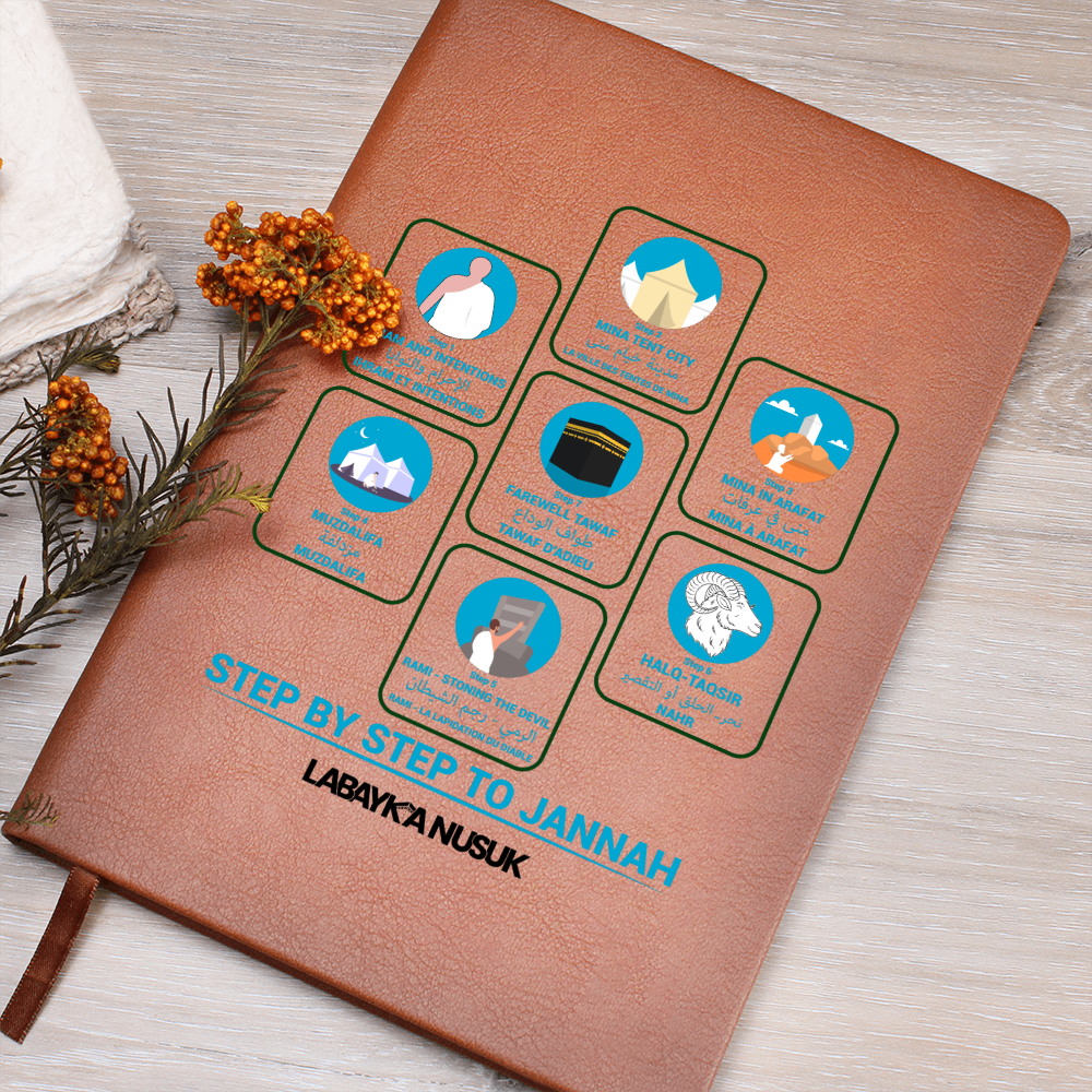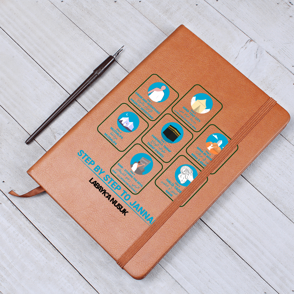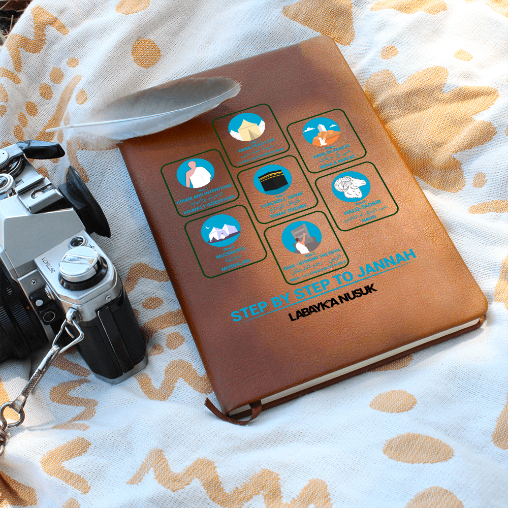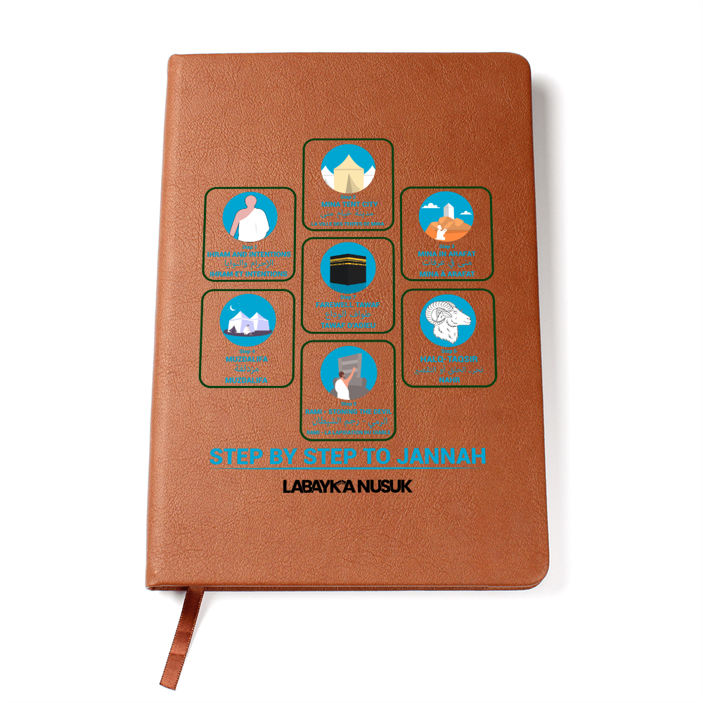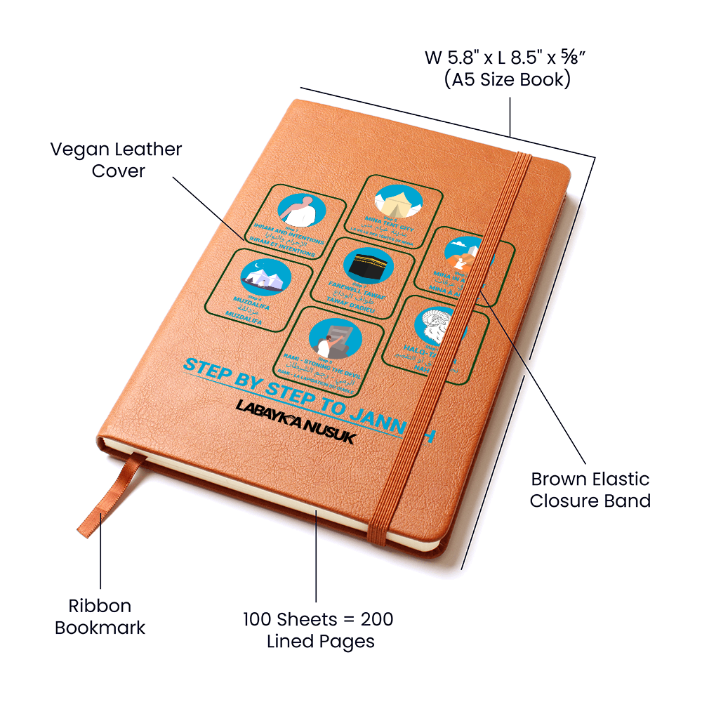 Le Bloc-notes Step by Step to Jannah Labayka Nusuk associe élégance et intention. Sa couverture en cuir végétalien présente un visuel pédagogique composé de pictogrammes, pensé pour rappeler, avec douceur, la progression du croyant dans ses œuvres et son organisation quotidienne.