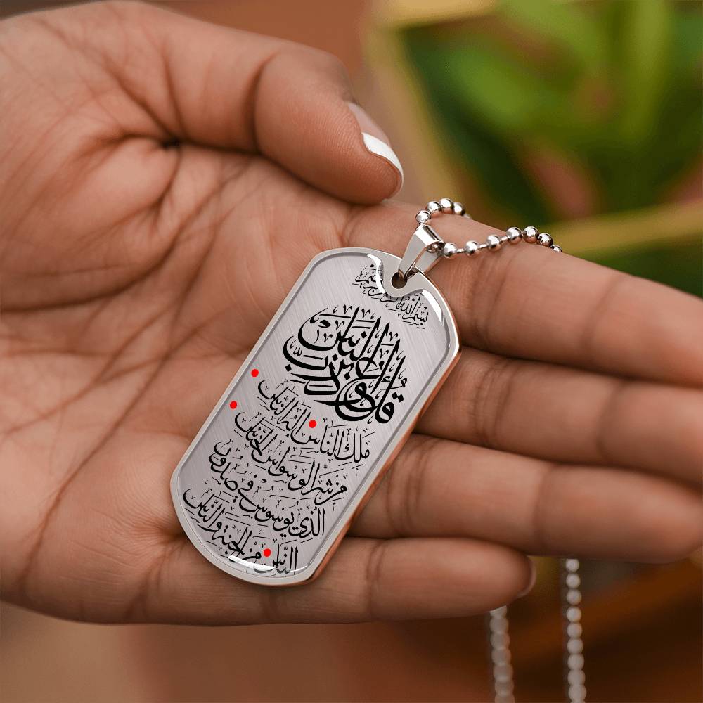 Ce collier militaire de luxe gravé de la Sourate An-Nâs (الناس) est un bijou spirituel et élégant. Fabriqué en acier chirurgical 316L ou plaqué or 18K, il incarne à la fois la foi, la protection et le raffinement. Offert dans un coffret cadeau, il peut être personnalisé au dos (prénom, date, message court) pour en faire un souvenir unique.