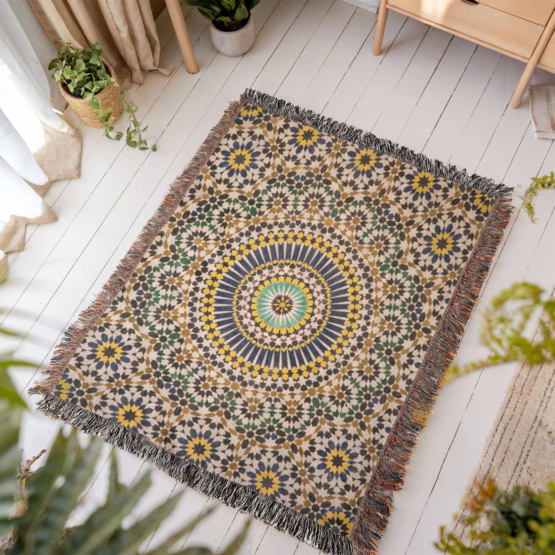 Le Tapis Couverture Zellige Marocain de Labayka Nusuk célèbre l’art ancestral du zellige, trésor du patrimoine marocain. Chaque motif tissé rend hommage à la géométrie spirituelle islamique, où chaque forme, chaque couleur et chaque symétrie reflète la perfection de la création divine.